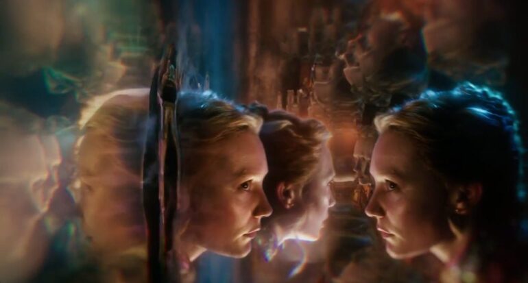 Alicia volvió a los cines después de seis años totalmente desaparecida, de la mano de un nuevo director, James Bobin, que retoma las aventuras de una Alicia adulta basándose en el segundo libro de Lewis Carroll: “A través del espejo y lo que Alicia encontró allí”. En esta segunda entrega Alicia ha estado lejos de su hogar mucho tiempo, viajando como capitana en el barco de la compañía mercante de su difunto padre, el “Maravillas”. Con tristeza, descubre que durante su ausencia su madre ha estado haciendo negociaciones con Lord Haymitch Ascot, el nuevo presidente de la compañía, con quien ella rechazó casarse. Han decidido poner a Alicia todos los impedimentos posibles para que no logre sus empresas y así frenar sus fantasías, sus raras ideas de vivir aventuras y ser una mujer independiente.