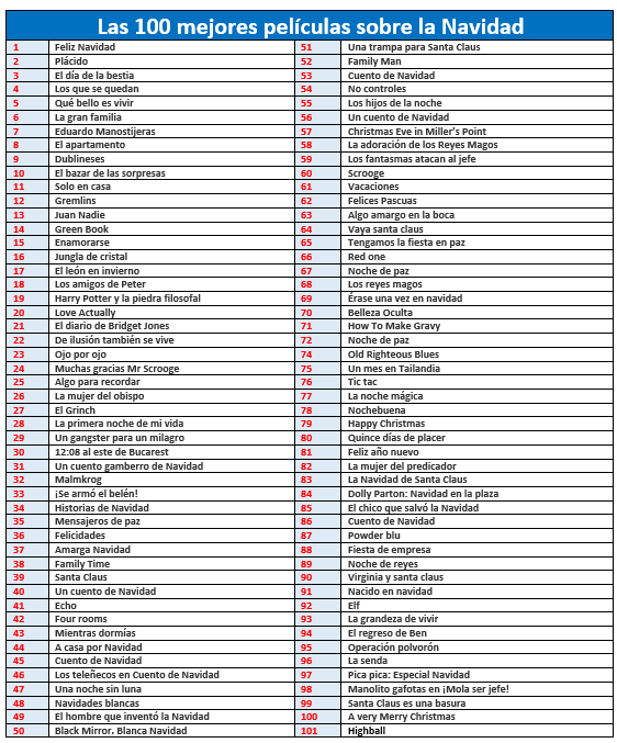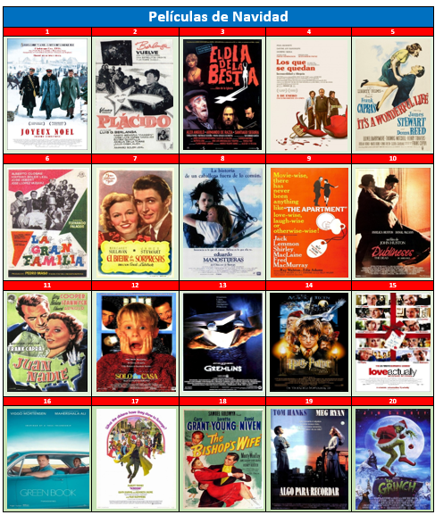 En mi base de datos hay 150 películas respecto a la Navidad, Nochevieja y Año Nuevo, incluyendo documentales y películas de animación; nueve de ellas están entre las 1.000 mejores del cine mundial y 40 entre las 10.000 mejores. Sin lugar a dudas, la mejor película es Feliz Navidad (2005), que estuvo basada en una historia real, sucedida durante la Navidad de 1914, a principios de la Primera Guerra Mundial (1914-1918) cuando, en diferentes zonas del frente, soldados alemanes, franceses y escoceses enterraron sus diferencias y sus muertos y celebraron la Nochebuena juntos.
