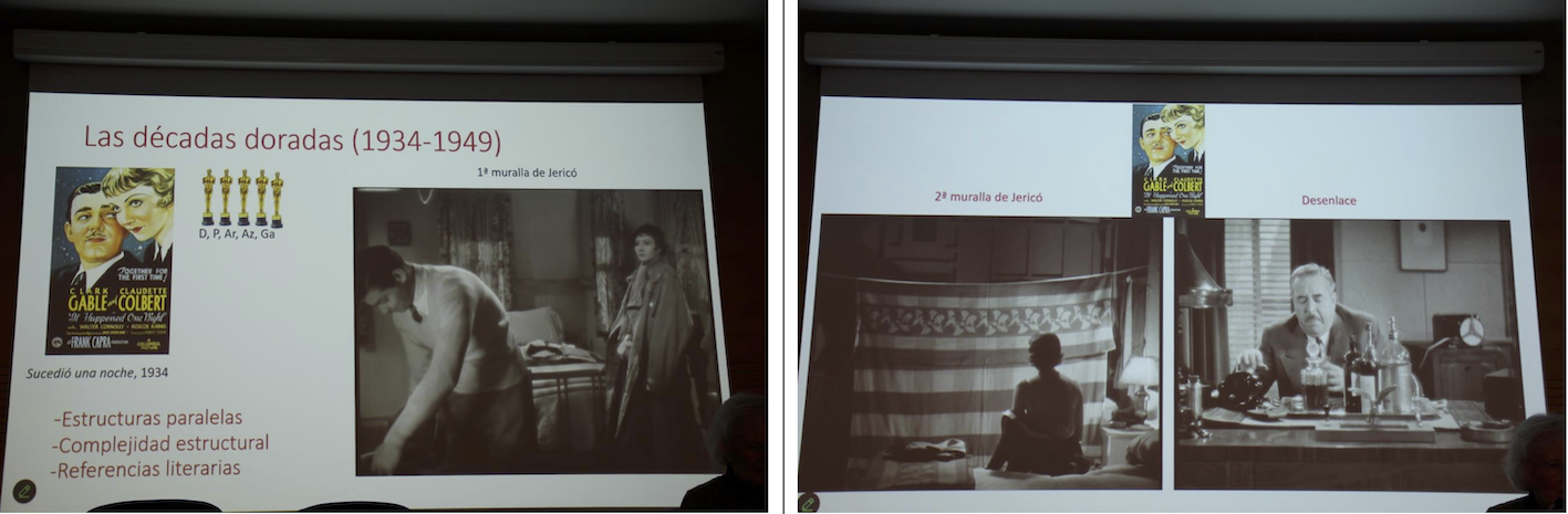 Después de orientarnos sobre las características de Sucedió una noche, pudimos ver tres escenas de esa divertida comedia romántica, considerada la primera screwball comedy. (El término se refiere a una comedia rápida y caótica, con diálogos ingeniosos, enredos absurdos y batallas románticas entre personajes, según nos explicó la profesora).